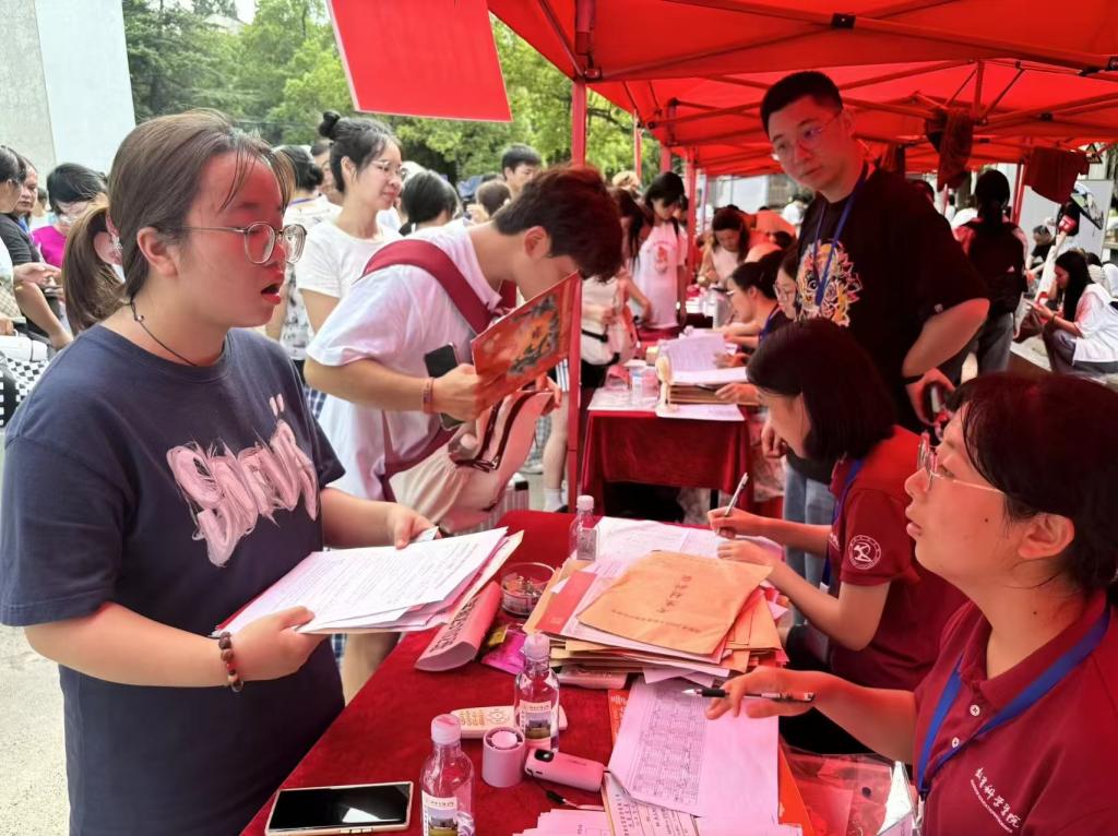 报到现场,新生们带着行李与憧憬穿梭于校园之中,或与家长一同参观校园环境,或用镜头记录初入校园的珍贵瞬间。学院迎新工作人员各司其职、积极配合,高效协助新生报到。学院还专门在报到区附近设置了家长休息区,为远道而来的家长们提供舒适的休息环境。