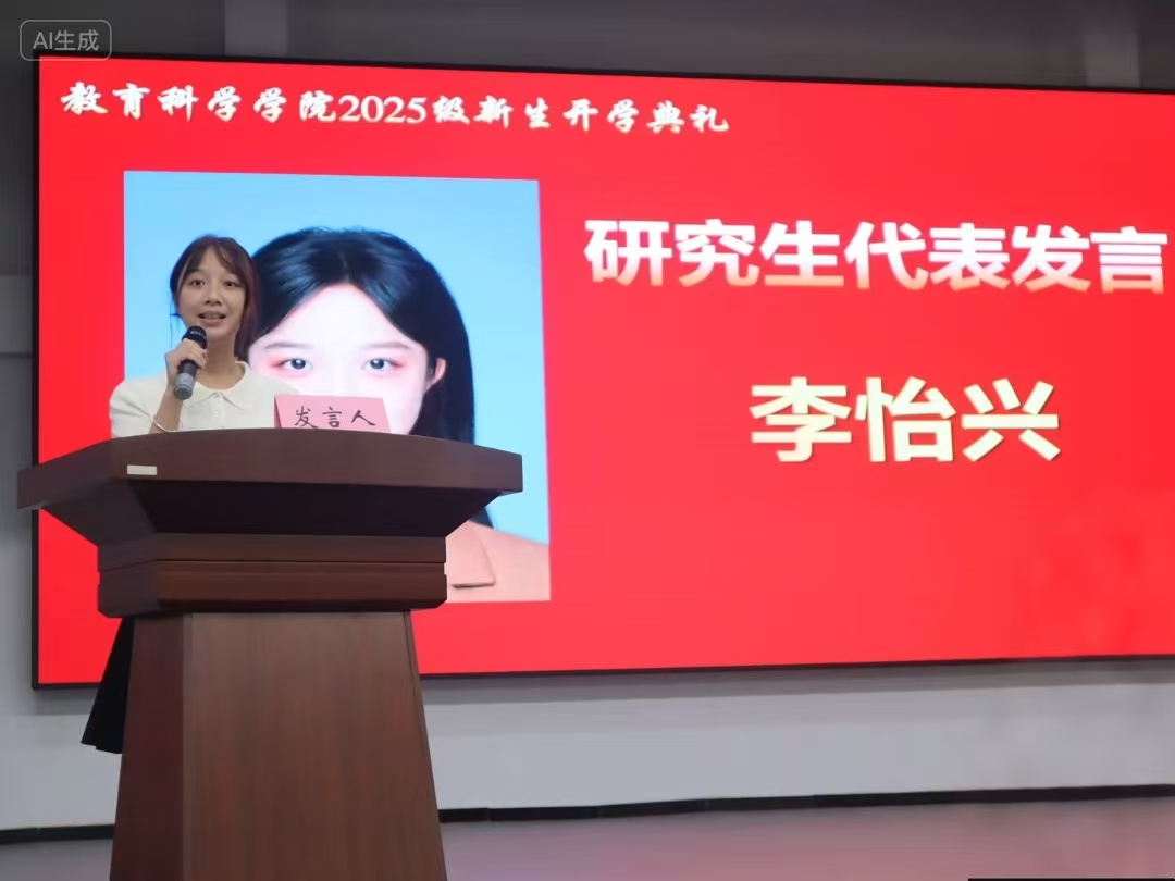 研究生代表李怡兴分享了从本校学前教育本科到小学教育研究生的成长历程,并向学院的培养表示衷心感谢。她表示她将在研究生阶段深入钻研专业知识,积极参与科研与实践,践行“博学弘文、明理求真”的校训精神,努力回报母校和社会。