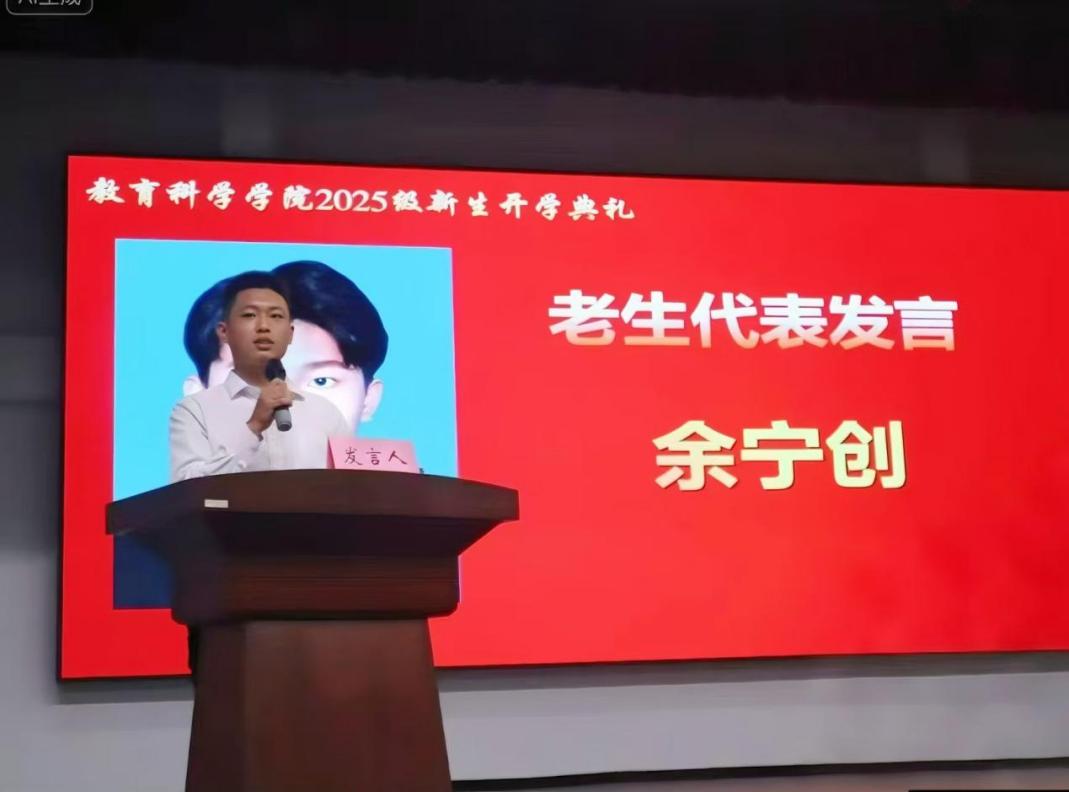 老生代表学前教育专业22101班余创宁分享了自己的大学学习与生活经历,以“尝试与寻找”、“责任与担当”、“连接与成长”三个关键词,鼓励学弟学妹勇敢尝试、坚守责任、主动交流,在教科院大家庭中书写精彩青春。