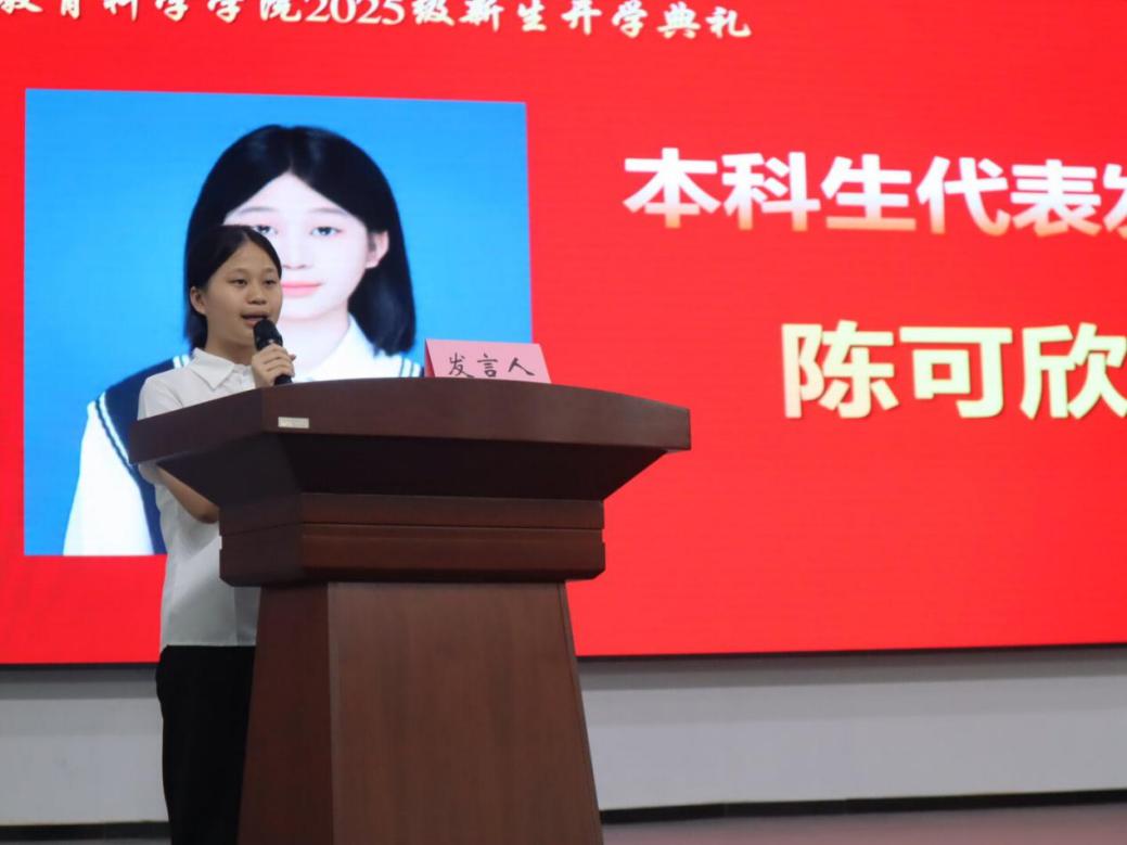 新生代表学前教育专业25101班陈可欣表达了对大学生活的憧憬与向往,代表全体新生承诺:一是转变角色、潜心求学;二是知行合一、勇于实践;三是修身立德、砥砺品格,以热情与努力开启大学之旅。