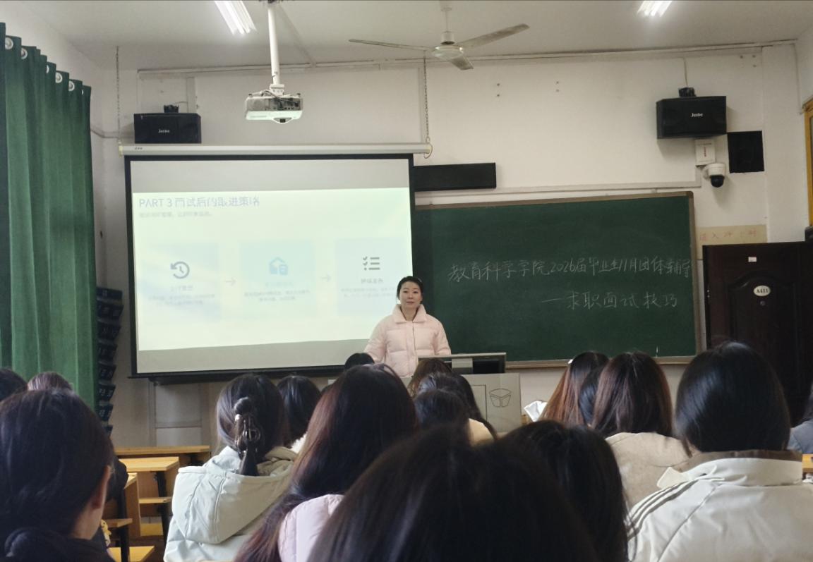 (本网讯张一弛)为精准提升师范毕业生的求职竞争力,湖南文理学院教育科学学院于11月13日面向2026届毕业生举办了“求职面试技巧”团体辅导。本次活动聚焦小学教育与学前教育专业特性,通过场景化模拟与专业化指导,助力学子实现从校园到职场的关键一跃。