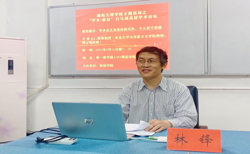 (通讯员龙晴琴)为进一步推进主题教育走深走实,5月16日晚,师范学院进行了“学术•前沿”白马湖高层学术论坛暨,北京大学马克思主义学院博士生导师林锋教授应邀作题为“学术论文及著作的写作:个人若干经验”的学术讲座。会议由高飞院长主持,常德学院和我校部分师生代表聆听了讲座。