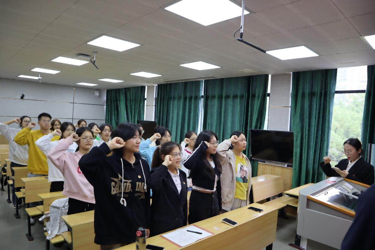 仪式上,先由学生会组织部副部长贾婧怡同学宣读覃媛、符紫涵等20名新团员名单,随后朱琦润同学为新团员佩戴团徽。在贾婧怡同学的带领下,新团员完成了庄严的入团宣誓并齐唱中国共产主义青年团团歌——《光荣啊,中国共青团》。