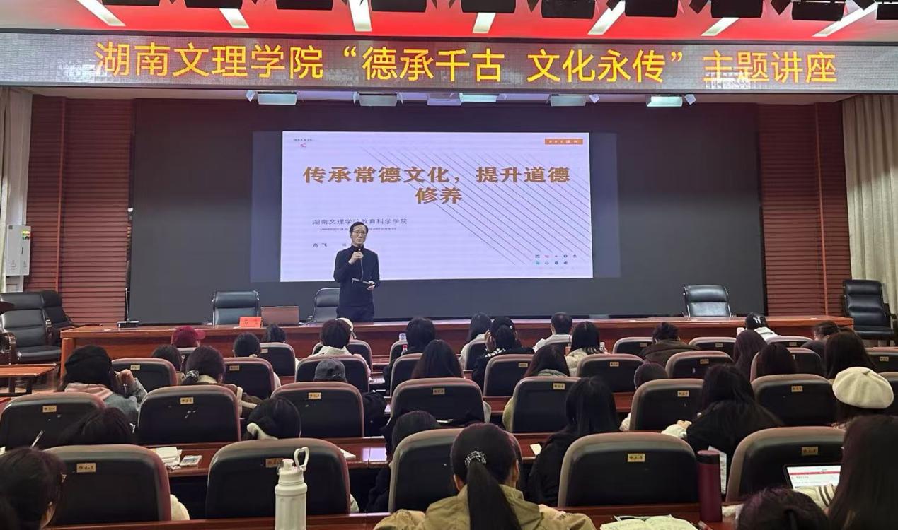 本网讯(通讯员 张一弛 周钰)为深入学习贯彻习近平文化思想,弘扬和传承地方优秀传统文化,引导青年学子树立正确的历史观和文化观,11月30日,教育科学学院党总支书记高飞在船型楼二楼报告厅举行了“德承千古,文化永传”主题讲座。